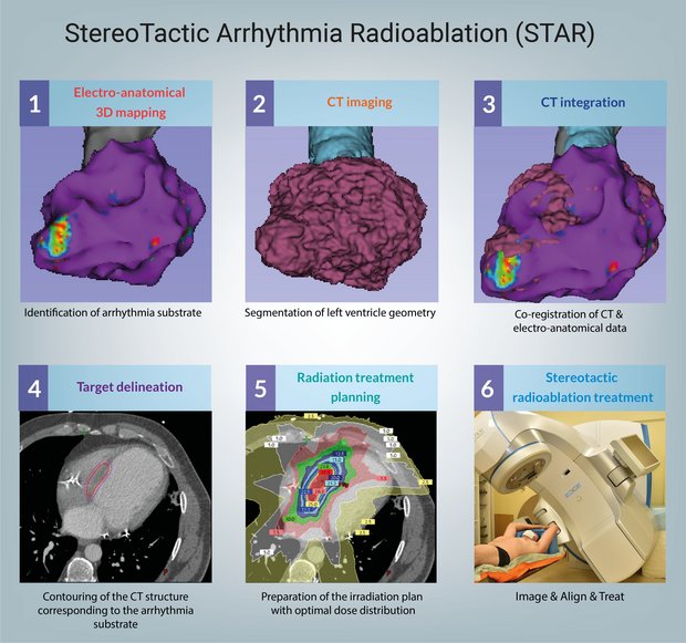STAR—Stereotactic Arrhythmia Radioablation—is an emerging treatment modality that involves delivering highly focused radiation to the arrhythmogenic substrate within the myocardium. Clinically introduced in 2012, STAR has been investigated in several preclinical and clinical studies, with promising results showing a substantial reduction in arrhythmic burden in otherwise untreatable VT patients. While clinical experience with STAR is still limited, it is rapidly expanding through ongoing single-center and multicenter trials at pioneering institutions.